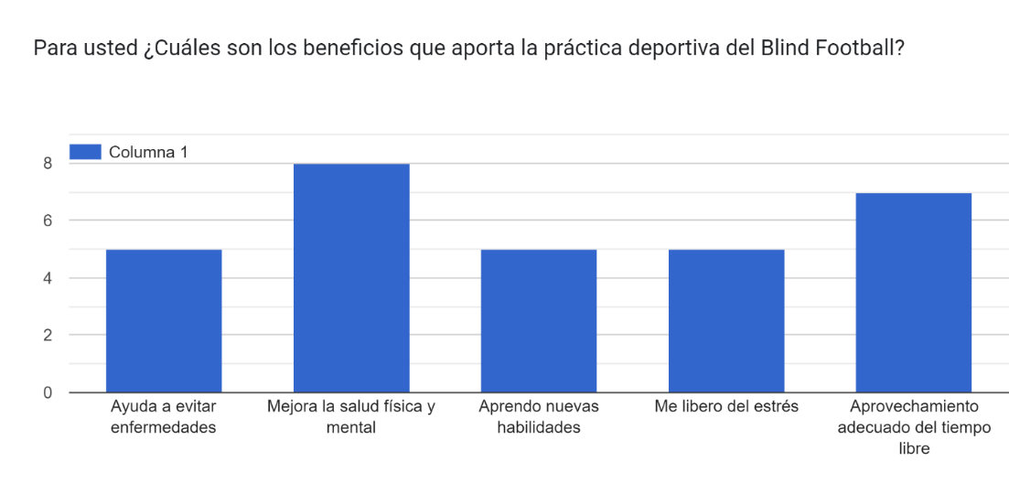 Con el objetivo de evaluar la estrategia pedagógica del Blind Football, analizando su contribución al aprovechamiento del tiempo libre y al mejoramiento de la calidad de vida de las personas con dificultades visuales de la Fundación Nueva Luz, se decidió aplicar una encuesta a la comunidad.[23] Esta encuesta incluyó 11 preguntas: 9 de selección múltiple y 2 de respuesta abierta, y fue aplicada a 10 deportistas con dificultades visuales. A continuación, se presentan los resultados obtenidos.